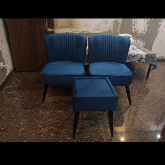 This is a chair set which has 2 chairs and 1 center table. The chairs are blue from front and back. The chairs have wooden legs and the wood used is Acacia. The center table has a top of glass and on the sides the blue print is used. The table legs are made from Acacia wood.