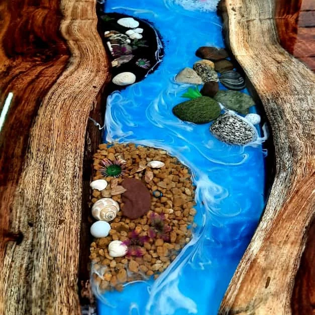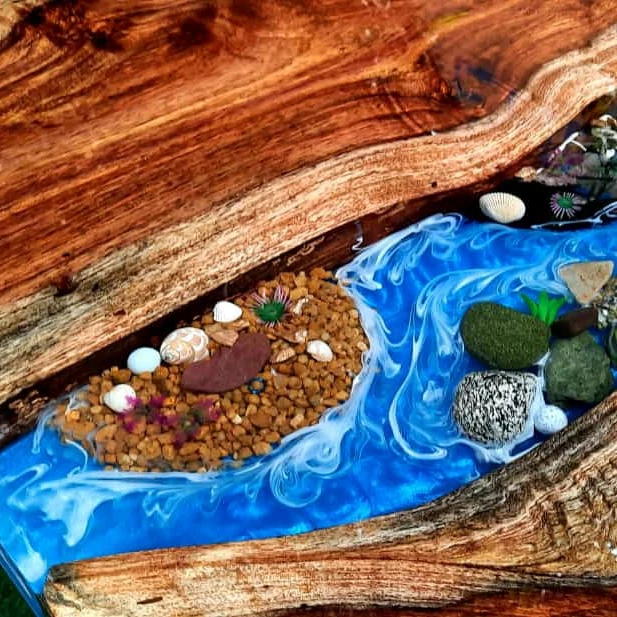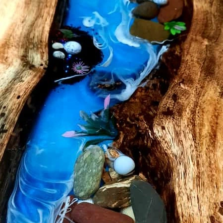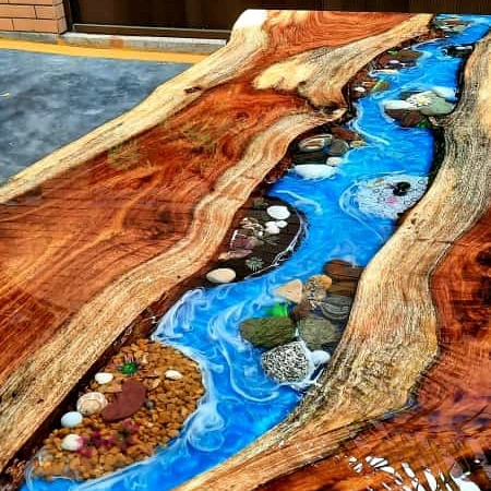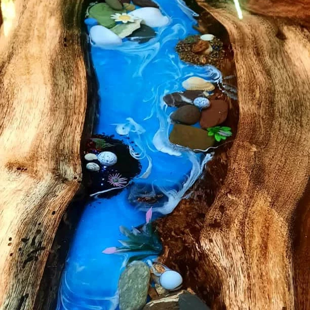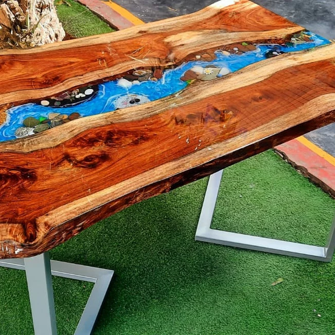 This an Epoxy table made with blue epoxy and wood and white rocks. The wood used in this table is Acacia and the finishing is of wax polish. The legs of the table are made of metal and the color of the legs are gray. The finishing of the legs is of powder coating.