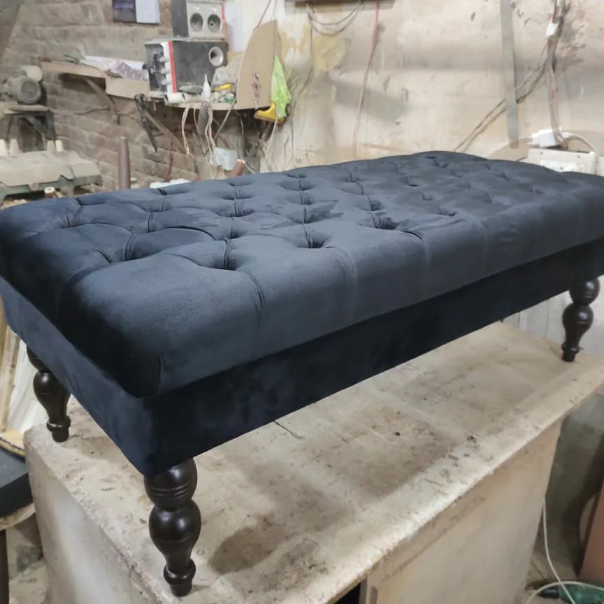 This is a ottoman with blue color and the cloth used is velvet. The legs are round. The wood used is Acacia and the color is Natural. The finishing is of wax polish.