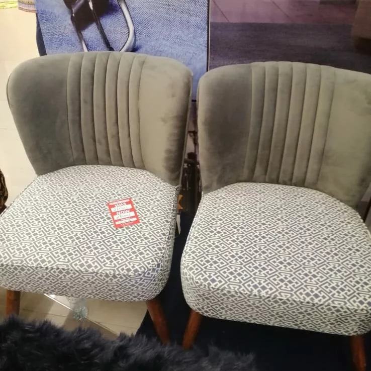 This is a chair set which has 2 chairs and 1 center table. The chairs are light brown from the front and are brown pattern printed on the back. The chairs have wooden legs and the wood used is Acacia. The center table has a top of glass and on the sides the Multi-color print is used. The table legs are made from Acacia wood.