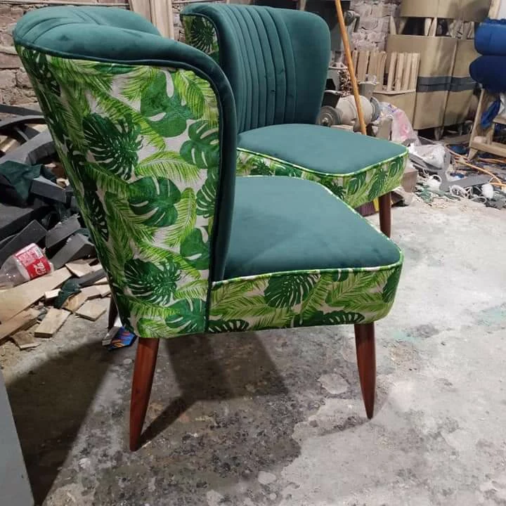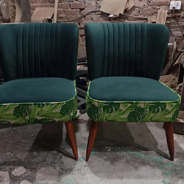This is a chair set which has 2 chairs and 1 center table. The chairs are green from the front and are green Leaf printed on the back. The chairs have wooden legs and the wood used is Acacia. The center table has a top of glass, under the glass is the leaf print and on the sides green print is used. The table legs are made from Acacia wood.