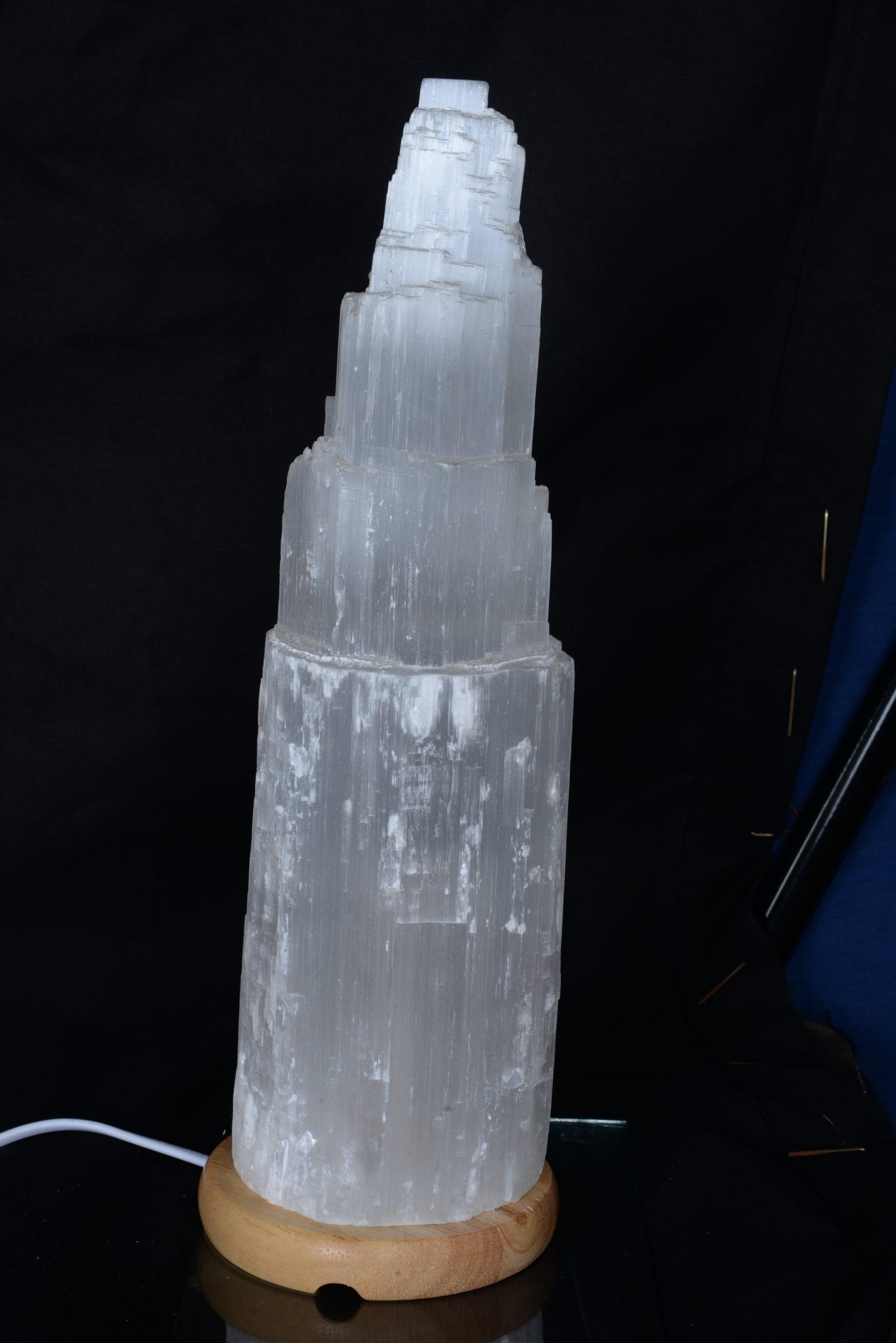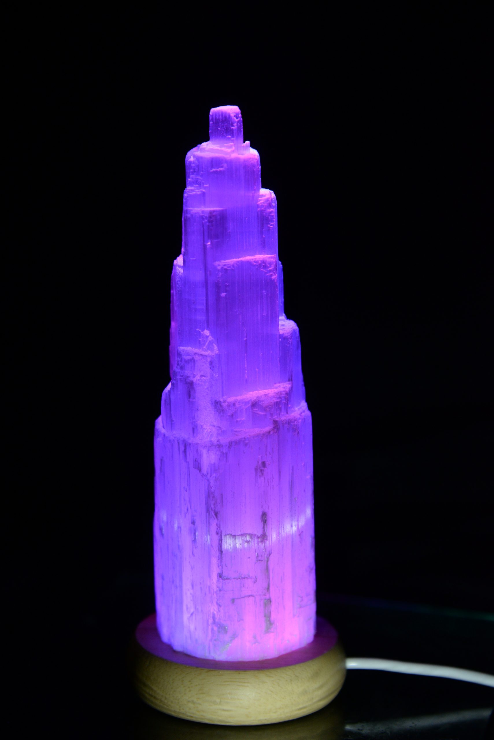 This is a Large Selenite lamp and it is 25 cm long. It has a wooden base made from Acacia wood and the color of the wooden base is natural. The lamp gives of rainbow light.