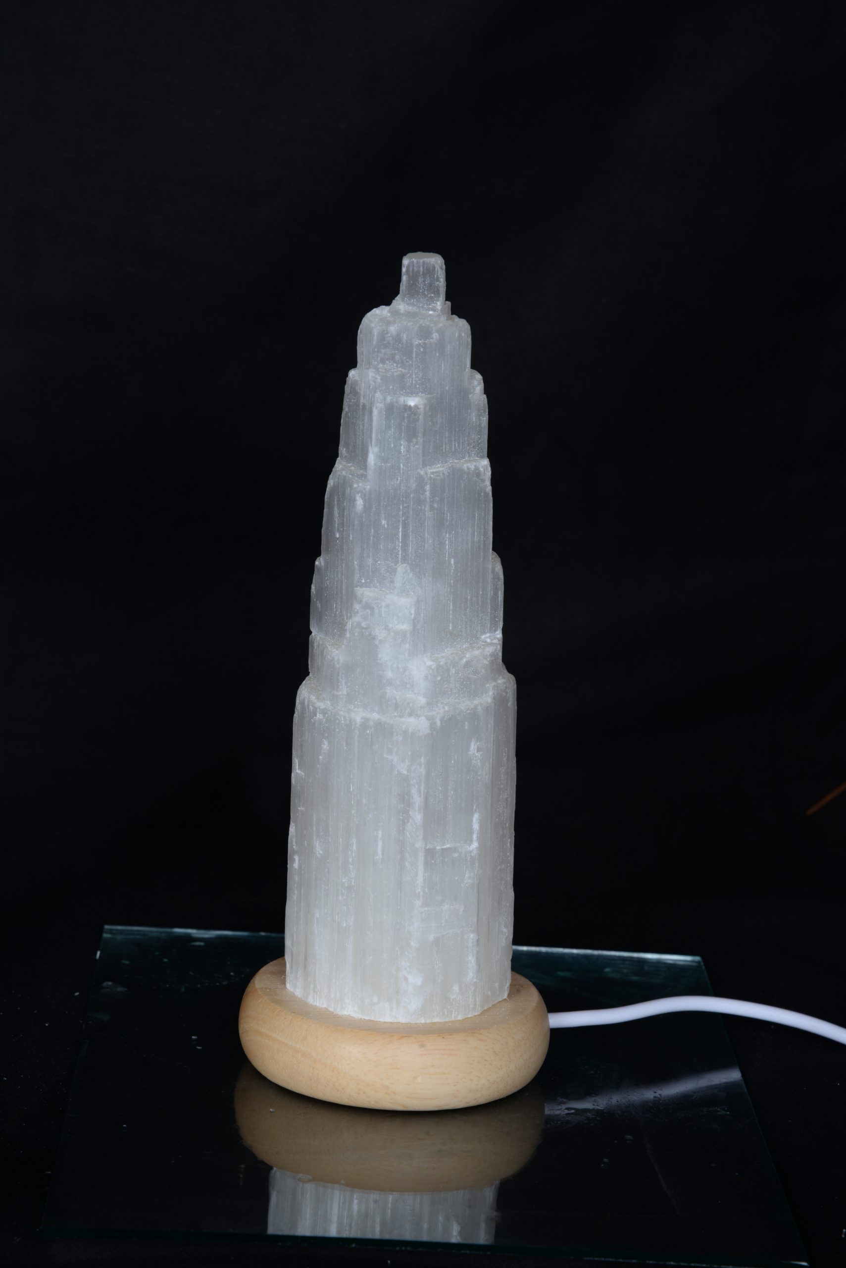 This is a Medium Selenite lamp and it is 20 cm long. It has a wooden base made from Acacia wood and the color of the wooden base is natural. The lamp gives of rainbow light.