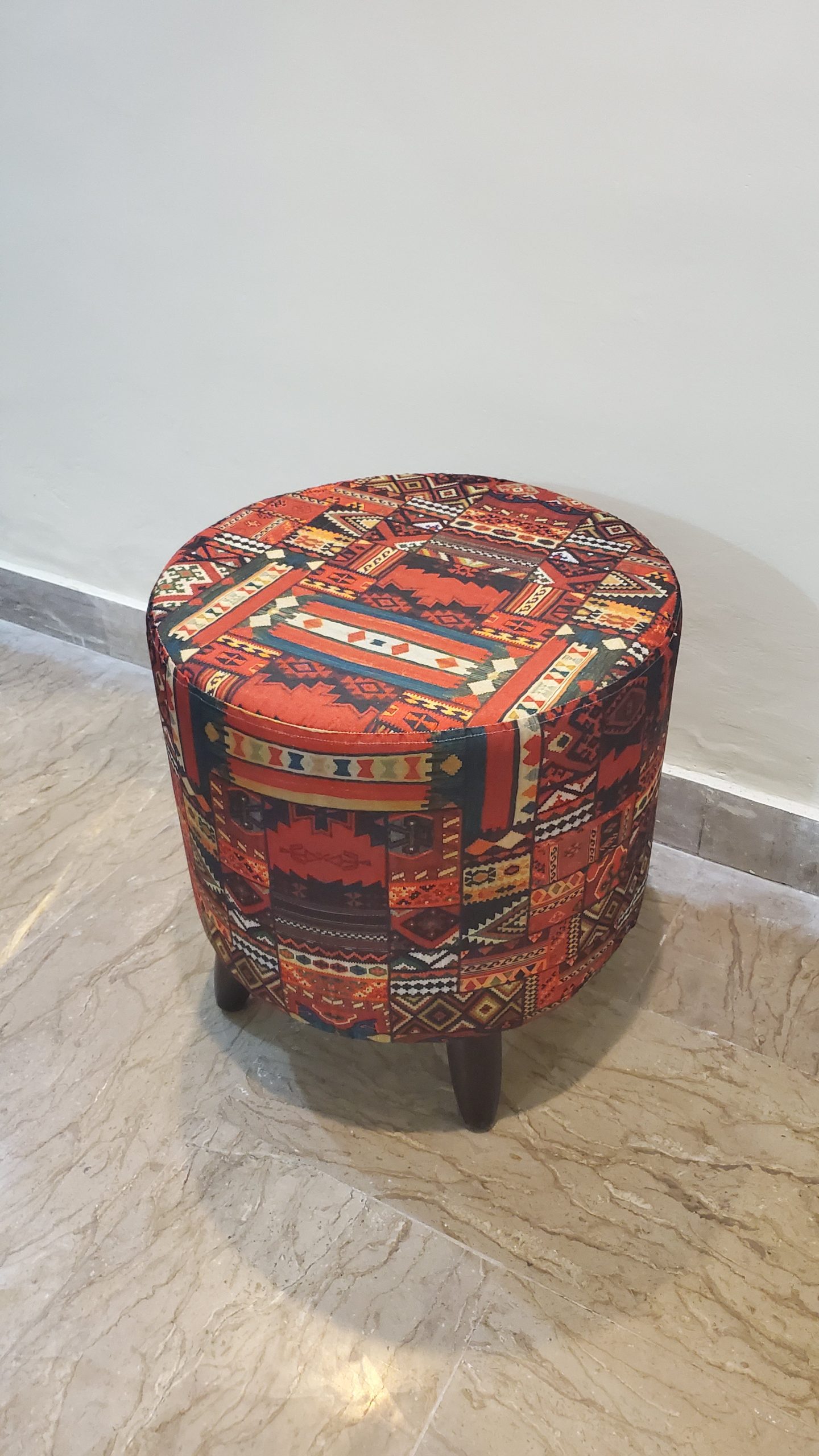 This is a Ottoman with round top which is multi colored and the sides are also Multi colored and it has wooden legs made from Acacia wood.