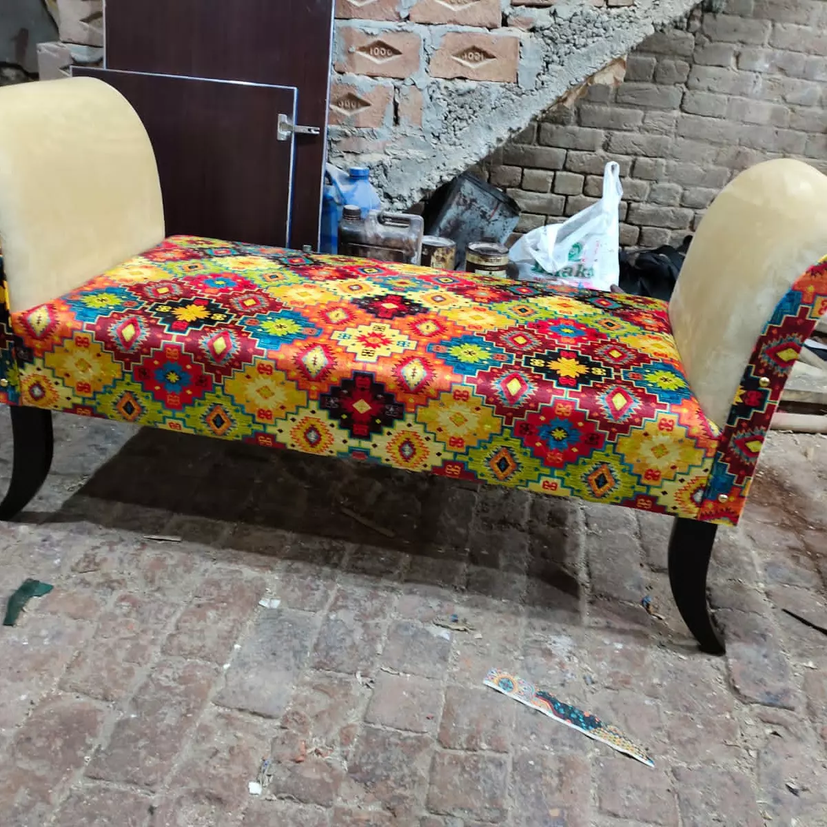 This is a settee which is 4 feet long and the color is off-white and Multi-color pattern. The settee is made from velvet cloth. The legs are square and are curved a little bit and the wood used is Acacia.