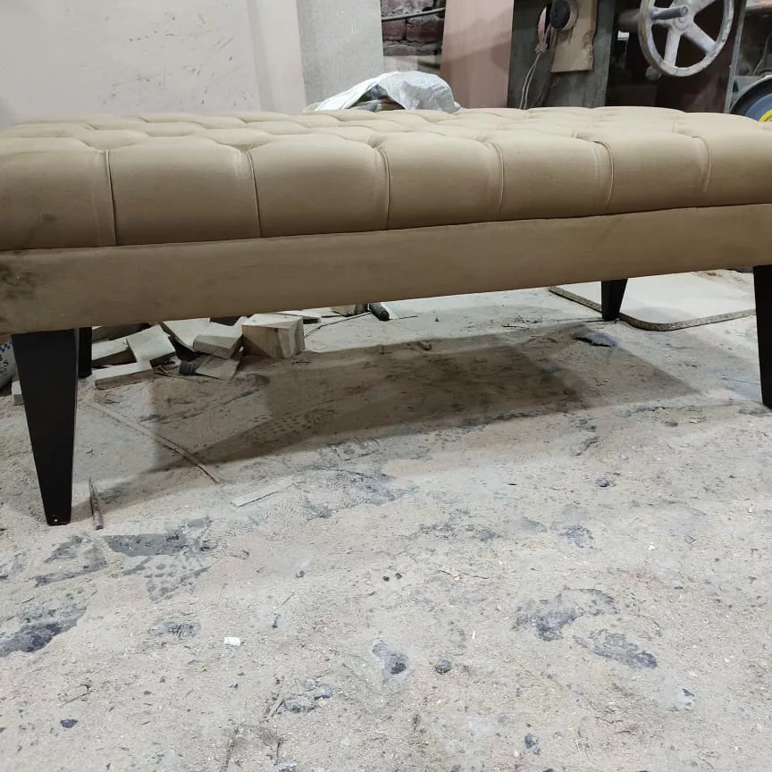 This is a ottoman with off-white color and the cloth used is velvet. The legs are square. The wood used is Acacia and the color is Natural. The finishing is of wax polish.