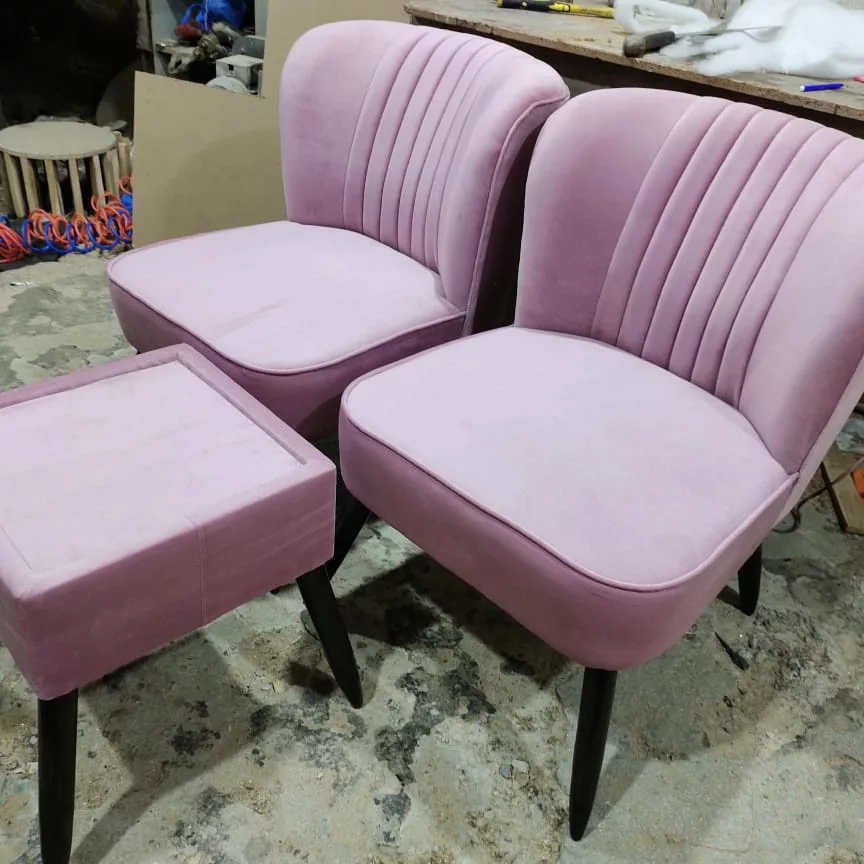 This is a chair set which has 2 chairs and 1 center table. The chairs are pink from front and Back. The chairs have wooden legs and the wood used is Acacia. The center table has a top of glass and on the sides the pink print is used. The table legs are made from Acacia wood.