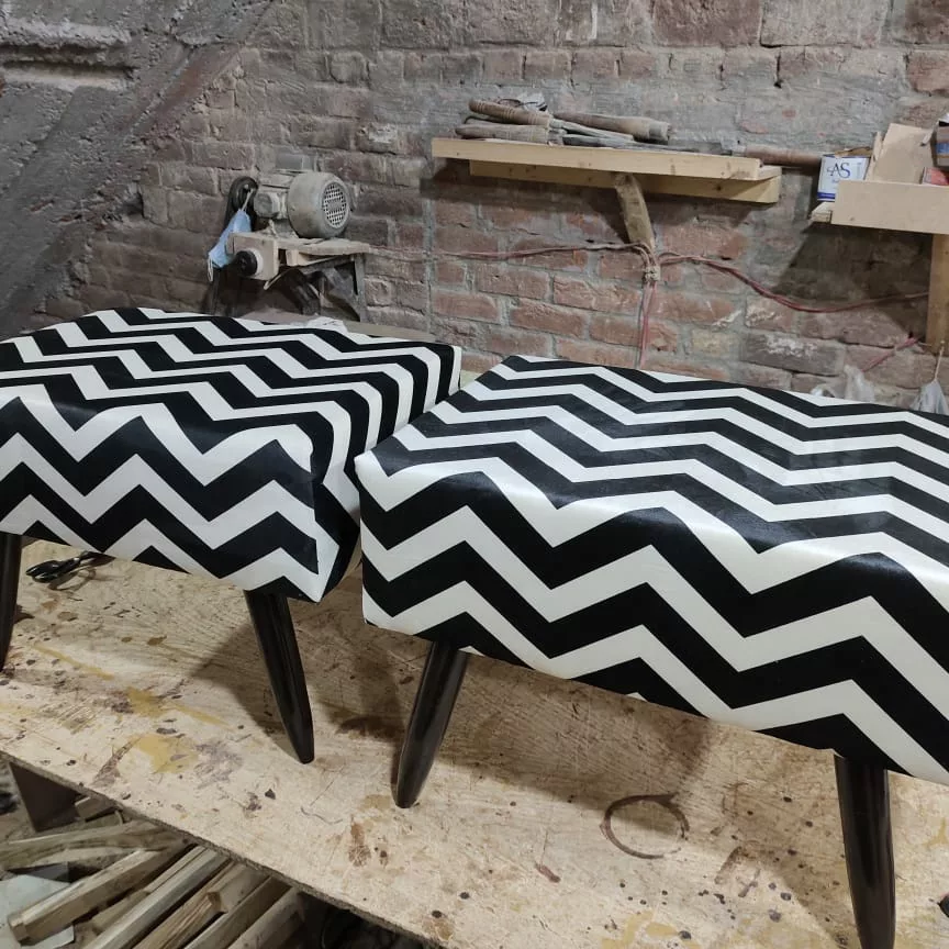 This is an rectangular Ottoman. It is made from Velvet cloth. The color of the ottoman is black and white. It has 4 round legs which are made from Acacia wood and the finishing is of Wax polish.