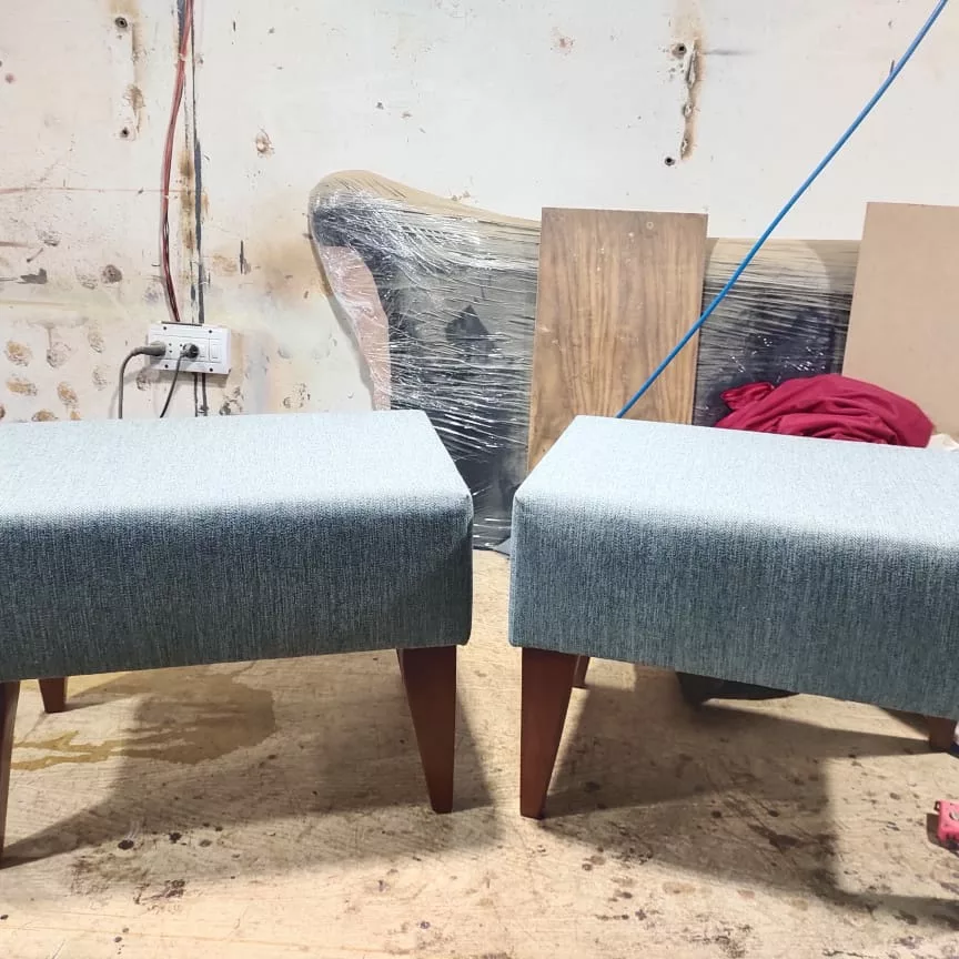 This is a Rectangular stool. It is made by velvet cloth and the color is silver. The Stool has 4 round legs and the wood used is Acacia. The finishing of the legs is wax polish.