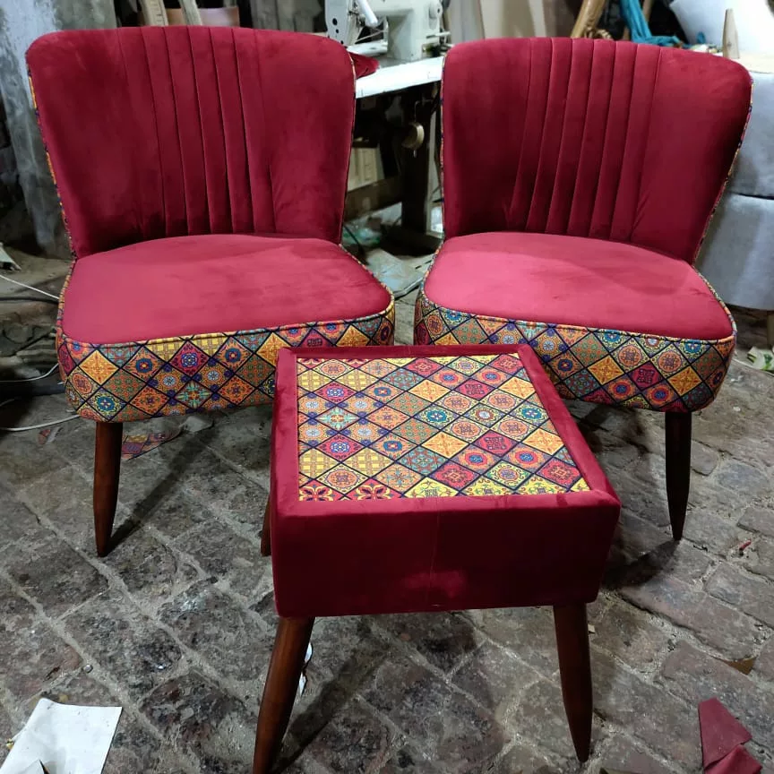 This is a chair set which has 2 chairs and 1 center table. The chairs are Red from the front and are multi-colored printed on the back. The chairs have wooden legs and the wood used is Acacia. The center table has a top of glass, under the glass is the Multi color print and on the sides the red print is used. The table legs are made from Acacia wood.