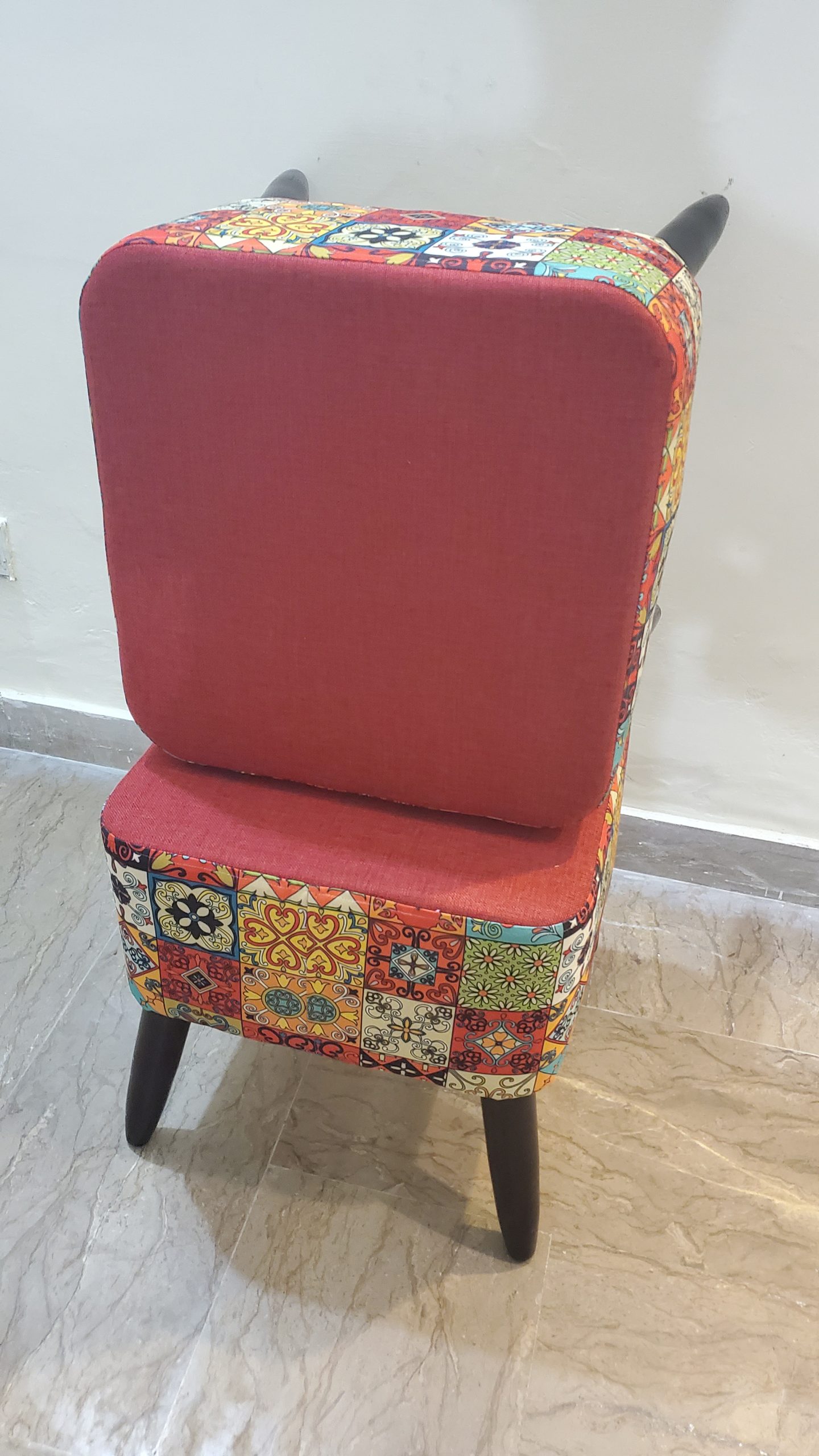 Velvet square stool with red top and multi colored sides and wooden legs made from Acacia wood.