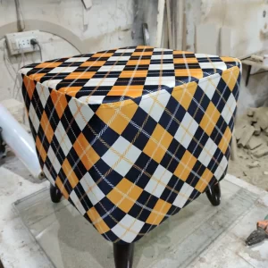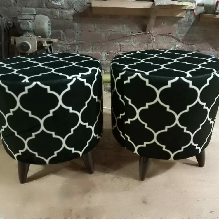This is a round Ottoman. The cloth used is velvet. The color of the ottoman is Black and White. It has 4 round wooden legs the wood used is Acacia. The finishing is of wax polish.
