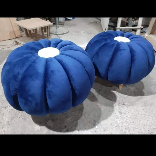 This is a round Ottoman. The cloth used is velvet. The color of the ottoman is blue and white. It has 4 round wooden legs the wood used is Acacia. The finishing is of wax polish.