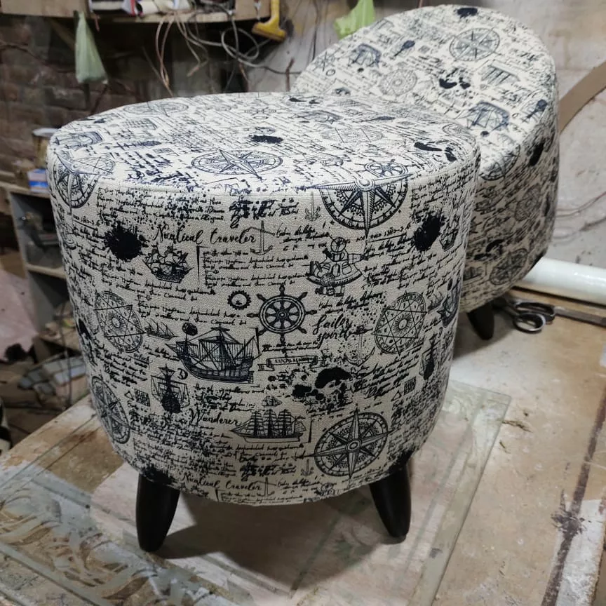 This is a round Ottoman. The cloth used is velvet. The Ottoman has a modern print . It has 4 round wooden legs the wood used is Acacia. The finishing is of wax polish.