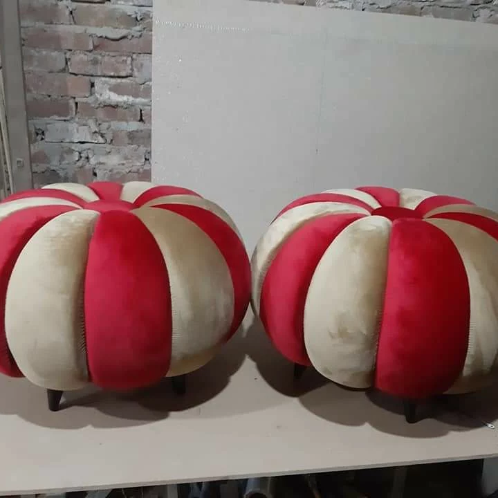 This is a round Ottoman. The cloth used is velvet. The color of the ottoman is red and peach. It has 4 round wooden legs the wood used is Acacia. The finishing is of wax polish.