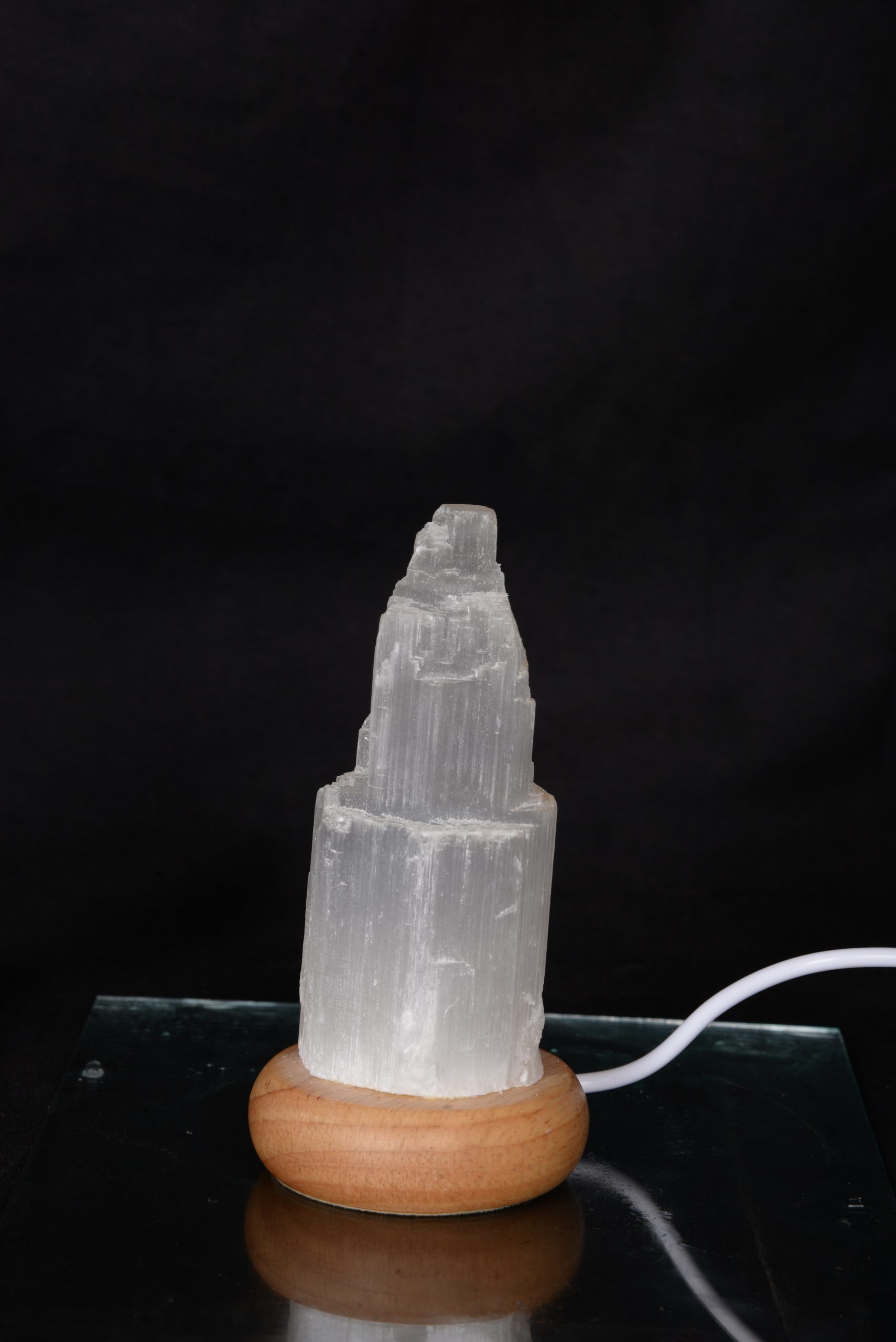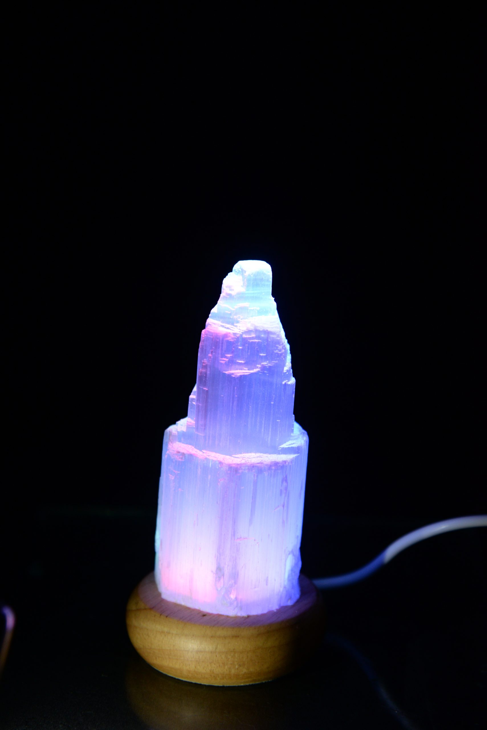This is a small Selenite Lamp and its size is 10 cm. At the bottom there is a wooden base and it is made from Acacia wood and the color of the wooden base is Natural. The lamp gives out rainbow light.