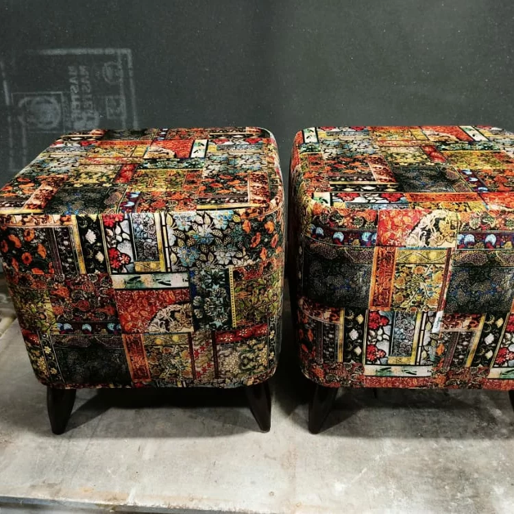 This is a square Ottoman. The cloth used is velvet. The color of the ottoman is Multi-colored. It has 4 round wooden legs the wood used is Acacia. The finishing is of wax polish.